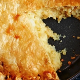 Tip: the onions and potatoes into a bowl and add the cheeses and cream. Taste and add a little more seasoning if it needs it. Gently stir together, then tip into the pie dish. Put the pastry lid on top and trim the edges so the bottom and top are the same size, then crimp with your forefinger and thumbs, to seal. Wash with egg, then bake at 190C/fan 170C/gas 5 for 40 minutes until deep golden. If freezing, cool completely, then cover and transfer to the freezer. To reheat, defrost in the fridge overnight, then heat the oven to 180C/fan 160C/gas 4. Unwrap the pie and reheat for 20-30 minutes until piping hot. Leave for 10 minutes before cutting into wedges.