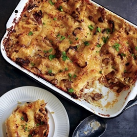 Spread a generous layer of mushroom mixture on top of the pasta, and follow with some grated Fontina and Gruyère.