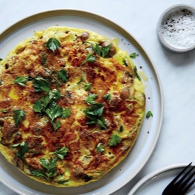 Put a large, flat plate on top of the skillet and carefully invert the tortilla onto the plate. Slide the tortilla back into the skillet and cook until the center is set, 1 to 2 minutes longer. Slide onto a serving plate, brush with olive oil and garnish with parsley.