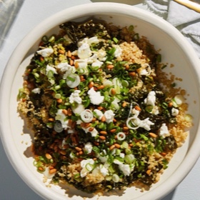 When the quinoa and kale are done, fluff the pilaf, and tip it into the waiting bowl with the remaining ingredients. As the hot quinoa hits the scallions and lemon it should smell lovely.