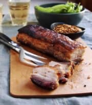 Third, for the best pork belly, I recommended that you cook and then wrap and chill it overnight before slicing (don't worry, the skin-on version with still have crispy skin). This has two benefits: it's much easier to slice and stays together beautifully when crisping up in a pan. That said, we almost always have a sample or two when it's fresh out of the oven because it smells irresistible and tastes amazing!