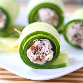 Roll cucumber around the ham and onion and secure by inserting a toothpick.
