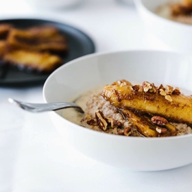 Divide the porridge between four bowls. Add the caramelized bananas, a sprinkle of chopped pecans and 1/4 cup coconut milk to each bowl. Serve immediately.