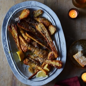 Spoon over the remaining tablespoon of oil, top with a snowy dusting of the remaining parmesan, sprinkle over the last quarter-teaspoon of cracked pepper and serve straight from the tray with the lemon wedges alongside for squeezing over.