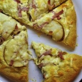 Brush with olive oil and add the pear, bacon and cheese blend.