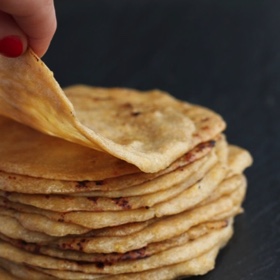 The more common are the larger ones, that look like bananas, and there are also shorter, fatter ones that are somewhat triangular. I tried this recipe with both, using 3 of the larger, more common kind, and 4 of the shorter, fatter ones. The recipe worked great both times. Since it’s not a baked good, and the starch in the plantains are a good part of what makes this recipe work, the measurement doesn’t need to be 100% exact. I’m guessing that the color of the plantain does have a lot to do with the outcome, though; green will not puree smoothly when raw, and if it’s gotten more brown than yellow, it will likely turn the tortilla quite sweet.