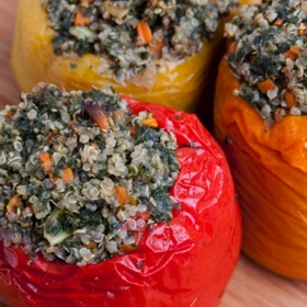 Typical stuffed peppers involve cheese and often white rice, but with the tasty seasonings and quinoa, you won’t miss those other ingredients. I used to use coconut oil to cook the veggies, but now as with most all dishes I cook, I omit the oil and saute in vegetable broth instead. I don’t even notice the difference in taste. Enjoy, and don’t forget to make extras!