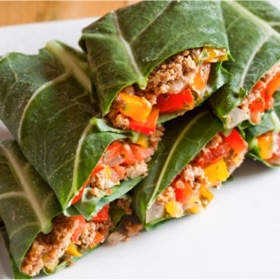 Take a collard green with the dark edge facing down on your cutting board. Trim off the stem and up about two inches into the leaf. Place about ¼–1/3 cup of the nut meat mixture in the middle of the leaf.