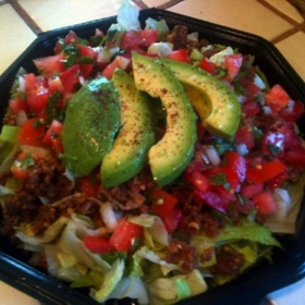 Add the salsa and top off with the avocado slices, fanned out. The avocado is optional, you can leave it out and get the substantial feeling of the salad from the nut meat combined with the veggies.