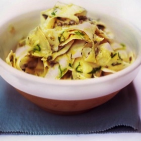 Once you’ve peeled the celeriac, chuck away the skin and then carry on peeling around it, giving you long ribbons. If they break every now and again it doesn’t matter. Continue until you reach the fluffy tasteless inner core, which you should throw away.