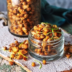 These healthy roasted chickpeas and beans are delightfully snackable, seasoned with cumin, coriander, chilli and lime rind.
