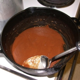 Heat a heavy skillet or cast iron pot and add oil. Once oil is heated, slowly add the flour, stirring constantly until all is blended. Continue to cook over medium to low heat, stirring constantly until flour and oil blend to form a brown roux the color of a dark copper penny. The longer you cook it, the darker the roux will become. Remember don't rush the cooking of the roux; allow the mixture to develop at its own pace. Transfer to cooking pot and add warm water to hot roux for thickness desired.