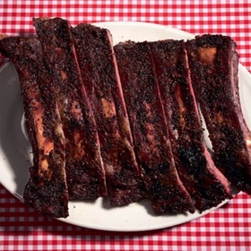 These beef ribs are an adaptation of the ones the chef Kenny Callaghan used to serve at the restaurant Blue Smoke, in Manhattan. For best results, order the ribs ahead of time from a butcher. (Pre-packaged ribs are generally too well-trimmed of meat for good barbecue purpose.) Ask for two back-rib racks trimmed from the prime rib, keeping as much meat on the ribs as possible, each rack approximately 6 ribs wide. That will do you brilliantly. Cook for a while in a bath of hickory smoke, then finish in the oven. Beef, salt, pepper, smoke, fat. You'll need napkins.