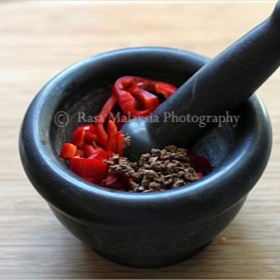 Transfer out and add to the chilies and start pounding with the pestle until fine. (Some people like their sambal belacan somewhat coarse so it’s personal preference.)
