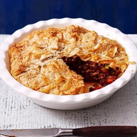 Spoon mince into dish, then fold the edges of filo over mince to enclose.