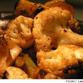 The cauliflower gets soft on the inside and crisp and caramelized at the edges, the mustard-olive oil mix gets condensed and flavorful and a little sticky, the garlic cloves become pungent and golden. The bacon, barely more than a condiment, adds depth and crunch (though it could easily be omitted).