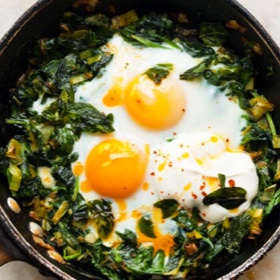 Make 4 deep indentations in center of spinach in larger skillet or 2 indentations in each small skillet. Carefully break 1 egg into each hollow, taking care to keep yolks intact.