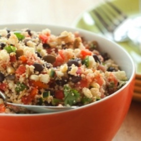A quick, colorful summer side for a barbeque or Cinco de Mayo (add diced jalapeño). It travels well to picnics—and the ingredients travel well to a vacation rental. For a gluten-free version, use cooked quinoa in place of preparing the couscous.