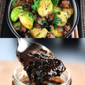 Add a little more oil to your pan. Add onion and ginger, and cook on high heat for two minutes or so until onions start to soften. Add mushrooms and stir. Next, add Brussels sprouts and mirin. Stir, cooking until Brussels sprouts start to get a little soft, but are still crisp. Stir in black bean sauce.