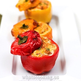 Pour mixture in the bell peppers and place them in a shallow baking dish.