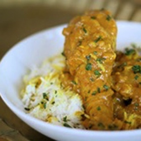 Serve chicken and sauce over a bed of basmati rice with a simple green salad on the side.
