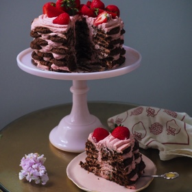 Take a cake disc and spread 1/2 heaped cup (really more like 2/3 cup) of the strawberry cream on the base. Place 7 cookies around the edge equidistant from each other and one in the centre. Spread with another 1/2 heaped cup of strawberry whipped cream. Place another layer of cookies between the space of the other ones. Spread with cream and repeat alternating the positions with each layer until all of the cookies and strawberry cream is used. Spread a layer of cream on top. Place in the fridge overnight or for at least 4 hours. Add cut and whole strawberries to decorate and slice up and serve.