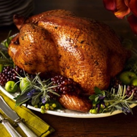 How long do I cook it? Most important is not how long but at what internal temperature to remove it from the oven, 175-180 degrees in the thigh. Taking the turkey out and let it rest for at least a half an hour before carving. In that resting period you will see the temperature of the thigh meat rise to 180-185 degrees. I'm going to give you an approximate time chart to aide you in timing your meal, but please don't use this chart as an exact time chart for cooking. It is far less accurate than taking the internal temperature. 1. 12 to 20 pound turkeys take approximately 20 minutes per pound. 2. 22 to 30 pound turkeys take approximately 18 minutes per pound. This chart reflects cooking times in a standard oven that is more than likely chock full of other food, so if you are roasting the bird alone the cooking times could be considerably less.