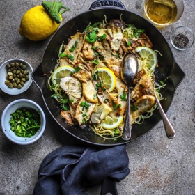 Merriam-Webster defines piccata to mean “thin slices of meat (veal) that have been dredged in flour, sautéed, and served in a lemon and butter sauce”. Piccata describes the method. The origins are Italian but the piccata-style is popular in the US, where chicken is often used instead of veal. Etymologically piccata is the feminine of piccato, past participle of piccare to lard (meat); probably from French piquer, literally, to prick (or possibly meaning sharp, “piquant”).