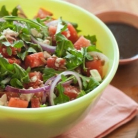 This refreshing salad makes a delicious first course or side dish for warm-weather meals. You can make it up to a day ahead, but add the arugula just before serving for best texture. If you'd like to save time by buying pre-cut watermelon, you'll need about 2 pounds of chunks to equal 6 cups diced.