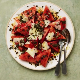 The red watermelon looks, and tastes, great here, but any other green- or orange-fleshed ripe melon will also work really well. Serve as part of a summer spread or at the end of a meal as dessert.