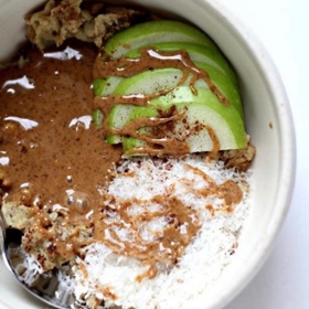 Top a mix of mashed banana and eggs with sliced apples, almond butter, coconut flakes, and cinnamon.