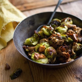 Here, wild mushrooms and brussels sprouts get crisp and golden in the oven while brandy-glazed chestnuts add a touch of sweetness. You can make the shallot-chestnut mixture the day before and refrigerate it in an airtight container. Sprinkle it evenly over the roasting vegetables during the last 5 minutes of cooking to warm it through.