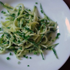Like pasta, zucchini is a great carrier of other flavors and sauces. I recently got a julienne gizmo that is like a peeler but makes tiny little threads of zucchini, carrots, cukes or wherever you apply it. A mandoline or benringer with a julienne blade also works(but not as safe for fingers or as much fun to use). I make this recipe all summer long with a variety of dressings, but this is one of my favorites. It is healthy and light; a great side dish or a light lunch. - dymnyno